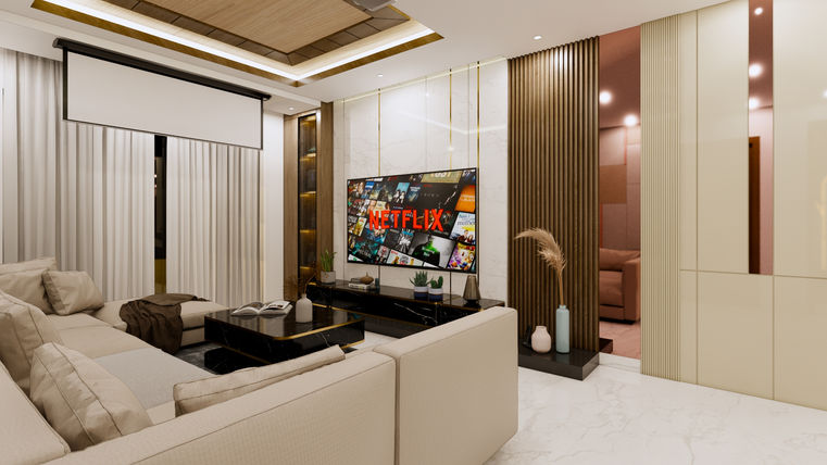 Experience the epitome of luxury living with a stunning feature wall that adds a touch of elegance to your space. The living room is a perfect combination of wood, marble, and fabric, creating a harmonious blend of textures.